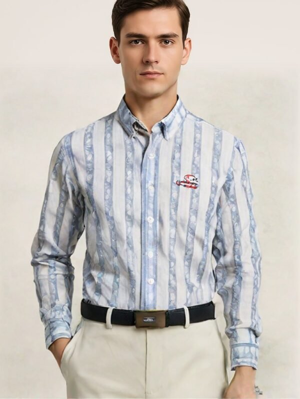 The image shows a young man wearing a long-sleeve, button-up shirt with a unique vertical striped pattern. The shirt features various shades of green, blue, and purple, giving it a watercolor or hand-painted effect. The stripes are irregular and vary in thickness, adding an artistic and modern touch to the design. The shirt has a classic collar, buttoned cuffs, and a front pocket on the left side. The man is standing against a plain light background, looking straight at the camera with a neutral expression. The overall look is casual yet stylish.