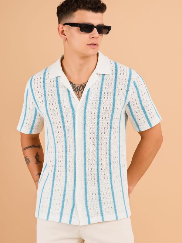 Beige Ribbed Knit Short Sleeve Shirt for Men